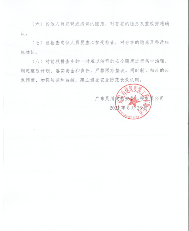 (二)C類安全隱患,項目部按要求責令立即進行整改,由分公司組織項目部進行C類隱患整改最終驗收。驗收合格后報公司質安部負責人簽字銷號。