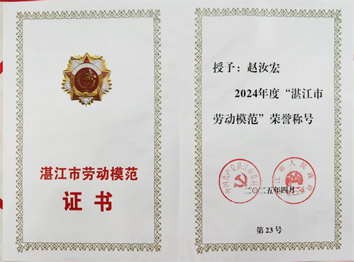 圖為趙汝宏榮獲湛江市勞動(dòng)模范