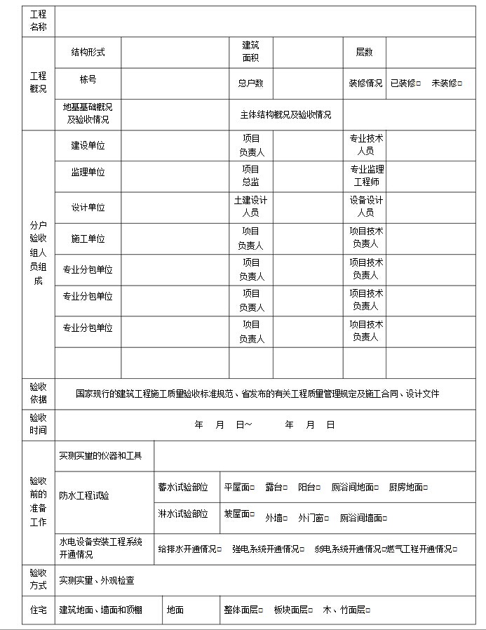 1、建設(shè)單位作為住宅工程質(zhì)量分戶驗收的第一責(zé)任人,應(yīng)根據(jù)工程 的實際情況填寫《住宅工程質(zhì)量分戶驗收方案》; |